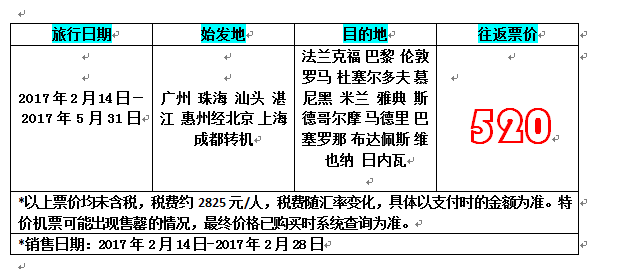 华南区域各大城市始发至欧洲热门目的地票价只要520元人民币!