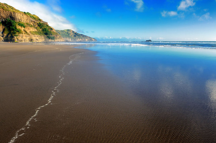 Muriwai海滩是奥克兰最壮观的黑沙冲浪海滩之一。黑沙是火山灰与沙石相混合后呈现出的颜色。Maori湾的激浪使得海湾常年都适合于冲浪,是进行水上滑伞、玩滑翔翼的极佳地,偏西风为这