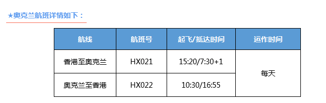 香港航空每天一班香港至奥克兰的直航服务,此航线香港航空使用空中客车A332宽体机型,每班24个商务舱座位,259个经济舱座位.